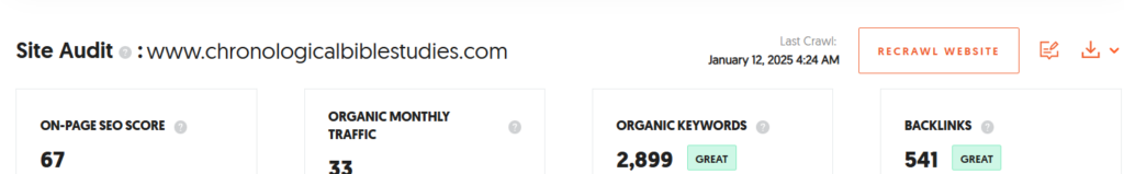 In 2024, Google Analytics overview recorded 31,100 visitors and 3,000 were new. Many visitors from all over the world come and visit, and they are all welcome. Rodney is continually improving these Bible studies, and adding audio versions as he is able. In 2024 most of the book of Genesis and all the book of Job were complete. Here are a couple of screenshots showing success in creating organic monthly traffic, organic keywords, and backlinks. Many more conversions will follow when money is spent on advertising by this not-for-profit organization. The words Chronological bible studies ranks #1 after paid advertising, and Rodney could help your organization rank higher than it currently stands.